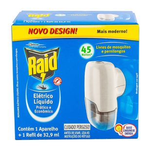 - Raid Elétrico Líquido 45 noites repele mosquitos por 45 noites sem que o refil tenha que ser trocado