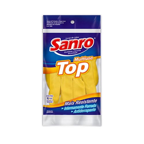 Elaboradas com látex de borracha natural de alta qualidade, as luvas Sanro Top conferem proteção às mãos dos usuários, preferencialmente para tarefas mais pesadas, que exigem maior segurança. São internamente forradas com flocos de algodão, proporcionam grande conforto e ótima maleabilidade. São antiderrapantes, têm um ótimo calçamento e dispensam o uso de talco.