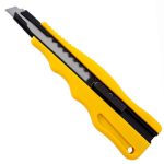 Corpo fabricado em termoplástico, guia da lâmina em aço carbono com pintura eletrostática e lâmina de 18 mm em aço carbono com alto teor de cromo. Indicado para: Serviço pesado, como corte de borracha, couro.