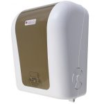Toalheiro Bobina Puxe e Corte Branco C/ Dourado Exaccta Ref. E-DBPC523 Material do Dispensador: Plástico ABS Papéis Utilizados: Papéis Toalha Bobina Branco: 20 cm x 100 metros / 20 cm x 200 metros Diâmetro máximo da bobina: 170 mm Cores do Dispensador: Branco / Cristal / Fumê Cores das Sobretampas:...